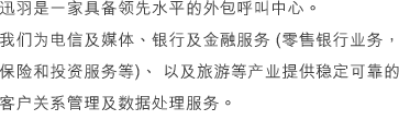 迅羽擁有豐富的客服中心建設(shè)及管理實務(wù)經(jīng)驗,熟悉各行業(yè)的運營情況,為客戶提供一站式的電話數(shù)據(jù)處理解決方案。
